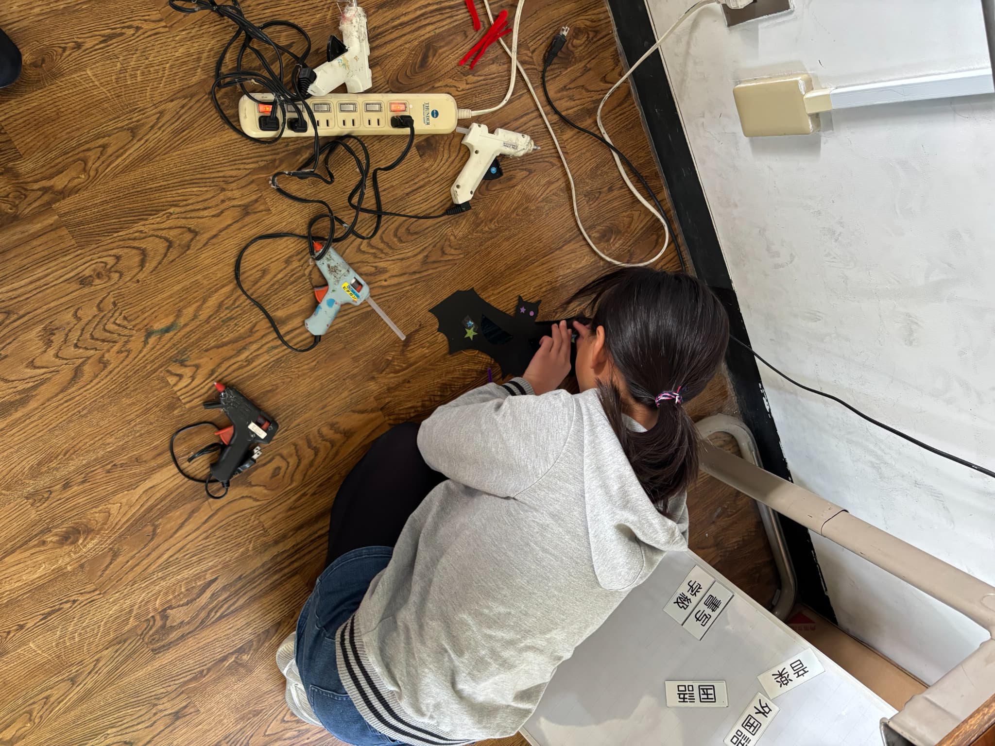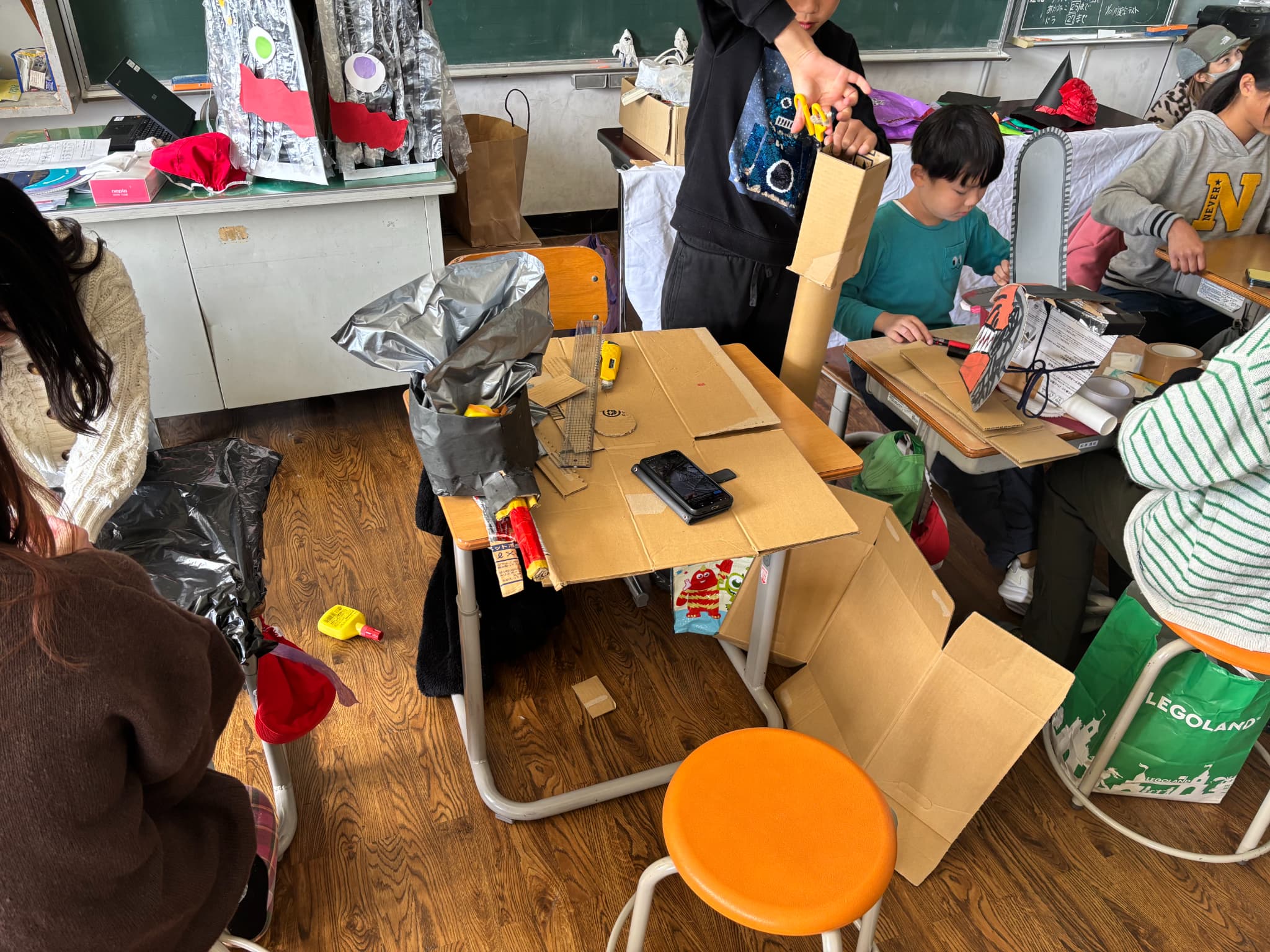 廃材や色紙、持ち寄ったものをつかって親子でハロウィンの仮装や小物などを作りました。